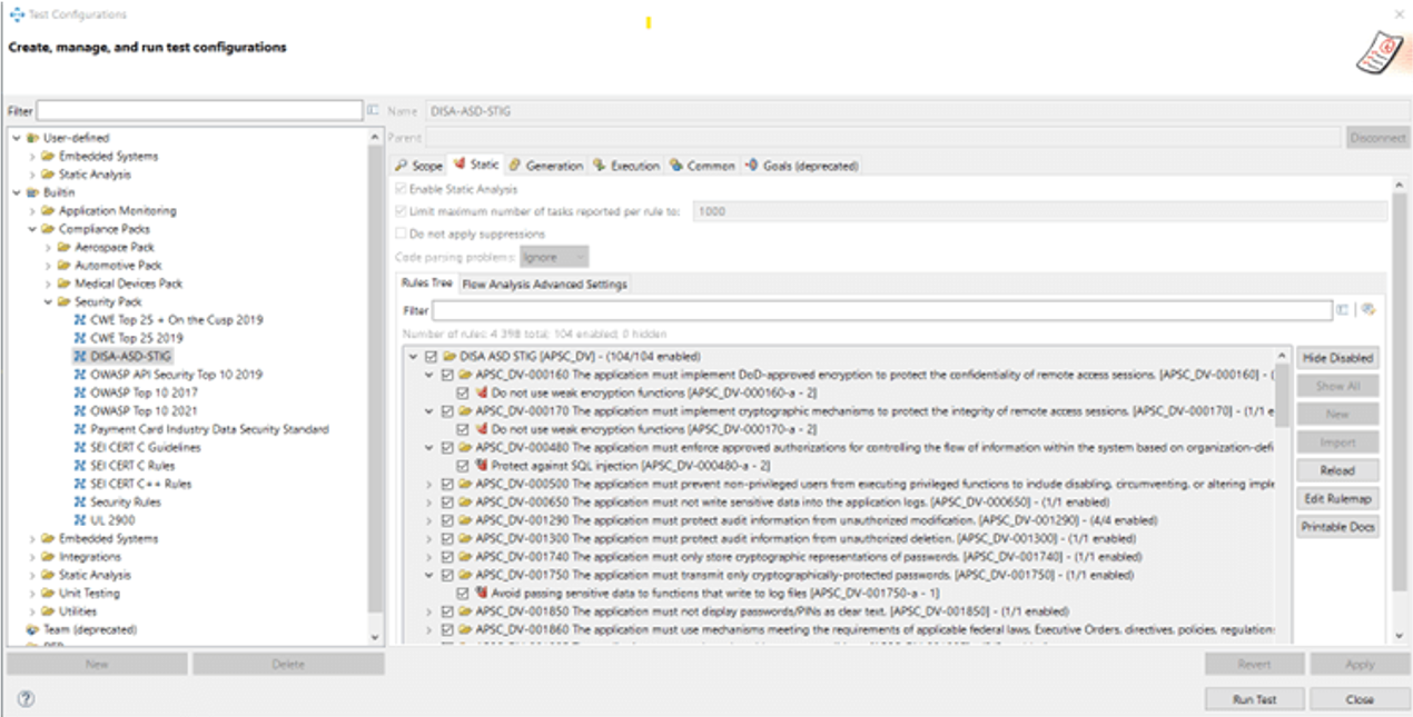 DISA ASD STIG明确要求扫描某些类型的漏洞。您可以使用具有高级静态分析功能的C++test来整理和分析结果,以便进行后续的报告和审计。违反指导原则的编码违规将通过STIG IDs进行报告,这消除了将SAST调查结果映射到STIG指导原则的需要,从而简化了法规遵从性工作。