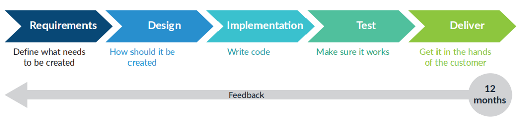 这种传统方法通常被称为“瀑布模型开发”,这种开发方法的挑战都来自于反馈循环。传统上,在瀑布式开发中,反馈周期需要长达12个月,而在今天的软件行业中,对于任何想要竞争的产品来说,这肯定会是致命点。有一些阶段,比如测试,它接受客户客户的反馈信息,但这些阶段都是有限制的,他不能无限制地接受。要真正理解客户的需求,必须让应用程序更快地进入市场。此外,经过12个月的孤立开发后,业务期望可能会发生改变,使得这些业务需求不再与开发工作同步。有了这些明显的限制,迫使我们需要更快的发布周期,敏捷开发就应运而生了。