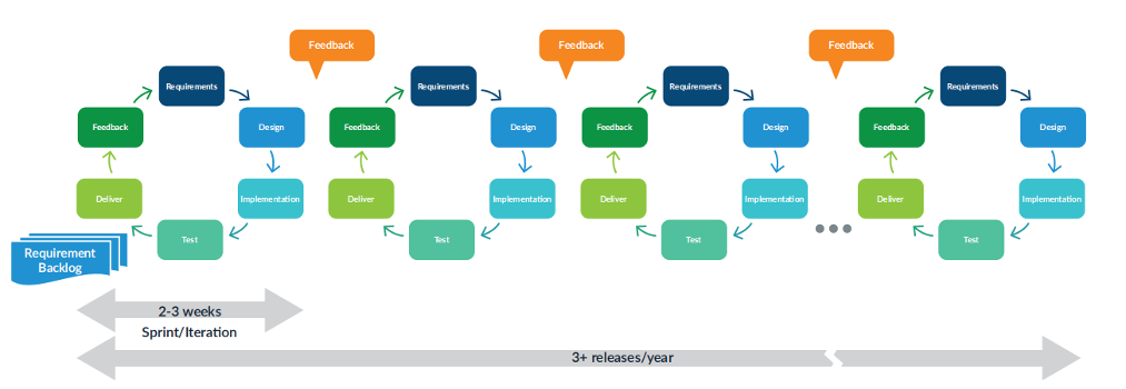 对于Agile,同样的软件开发生命周期(SDLC)基本原理也适用,原本的整个流程被压缩成一个一个的小循环(Loop),但是这种循环也是不断迭代的。这有很多优点,比如更快的反馈,能够对市场做出反应,能够随时发布,最重要的是,更准确的交付。