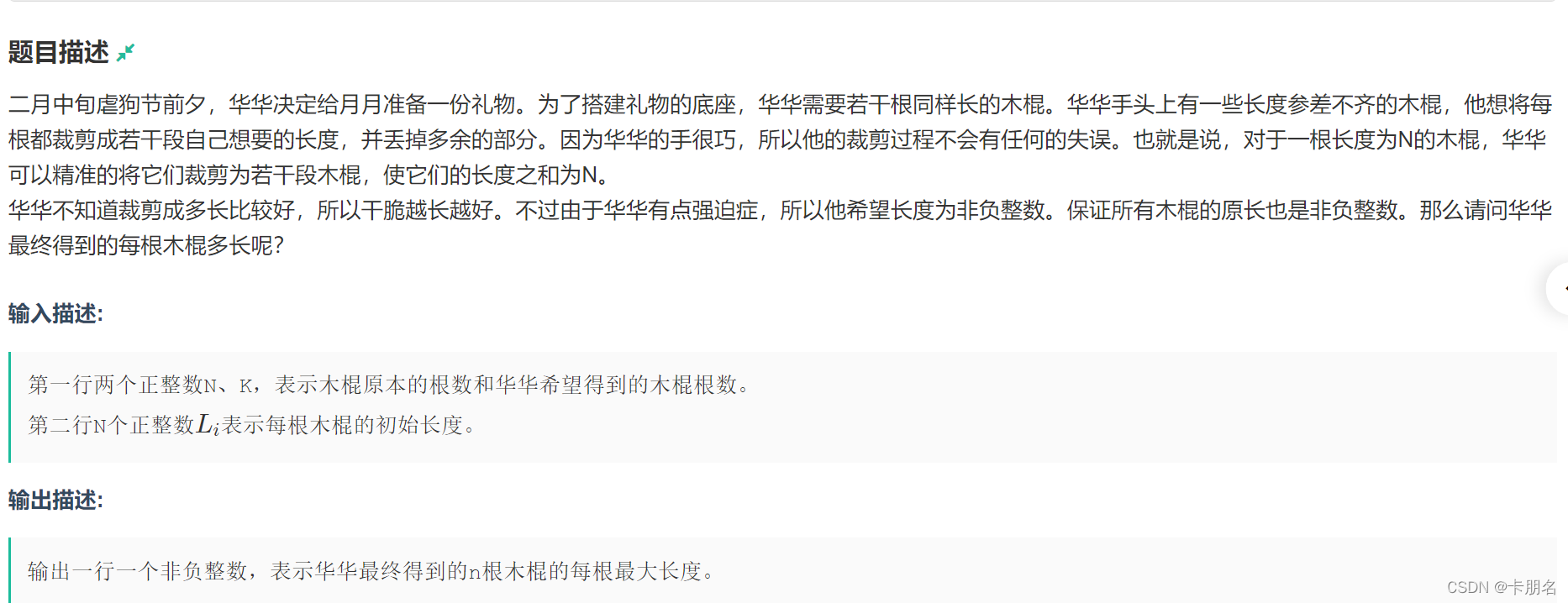 题目要求:输入正整数N和K,分别表示原本根数和希望根数,再自己输入各根木头的长度。