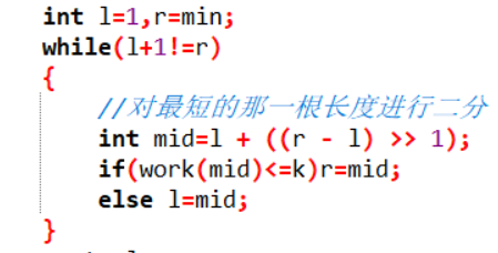 找到最短木棍后对他的长度进行二分处理,设定mid=(l+r)/2,如果得出的根数多了则说明短了,mid值右移 l=mid,反之相反。
