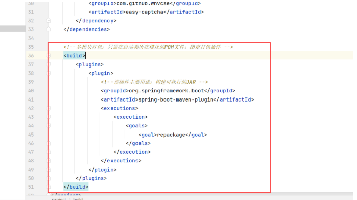 <!--多模块打包:只需在启动类所在模块的POM文件:指定打包插件 -->