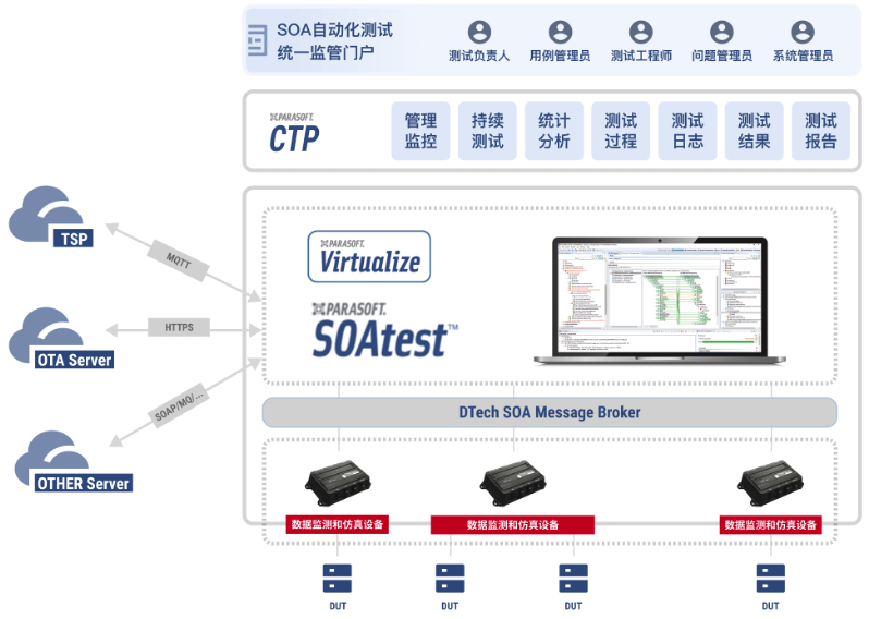 » 支持通过MQTT、HTTPS、SOAP、MQ等协议与TSP、OTA等云平台服务连通进行测试