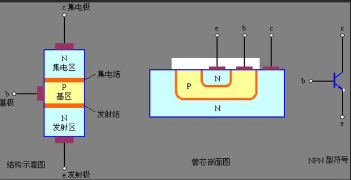 包含有两个PN结(集电结、发射结)、三个区(集电区、基区、发射区)、三个电极(发射极e、基极b、集电极c)。