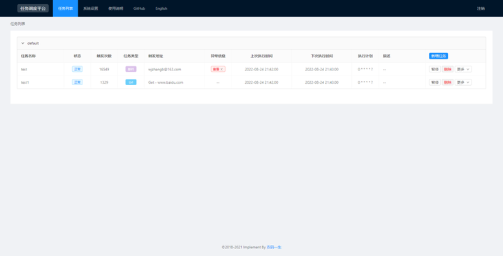 这是一个基于.Net 5+http://Quartz.NET 3构建的简单、跨平台任务调度系统。系统业务简单、代码清晰,如果您只是单纯只需简单任务执行、监控、提醒这套系统就非常适合。没有多余的功能,简单扩展下基本可以满足日常需求。每天会把任务执行异常的任务发送邮件提醒。部署环境建议部署在Docker上,不要部署在IIS,不然会自动回收。
