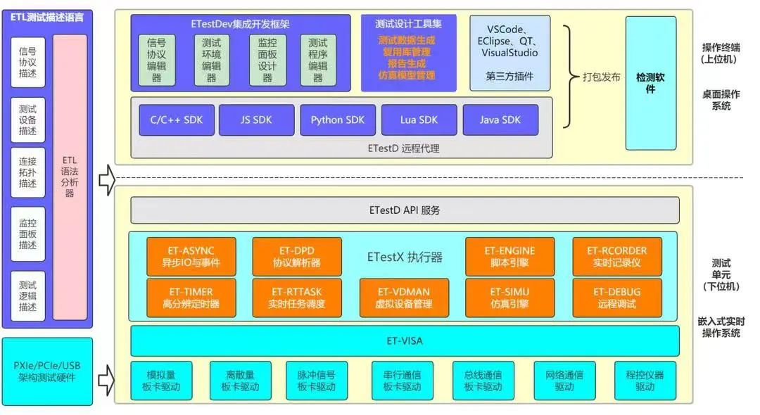 ETest可广泛应用于航空航天、武器装备、工业控制、汽车电子、仪器仪表等各行业测试工装、测试仪器等设备的研发。具有应用范围广、实时性强、开发效率高、使用简单、易于扩展、国产自主等特点,支持各种国产CPU+国产操作系统的部署方案,同时兼容Windows、linux、Mac等多种操作系统。