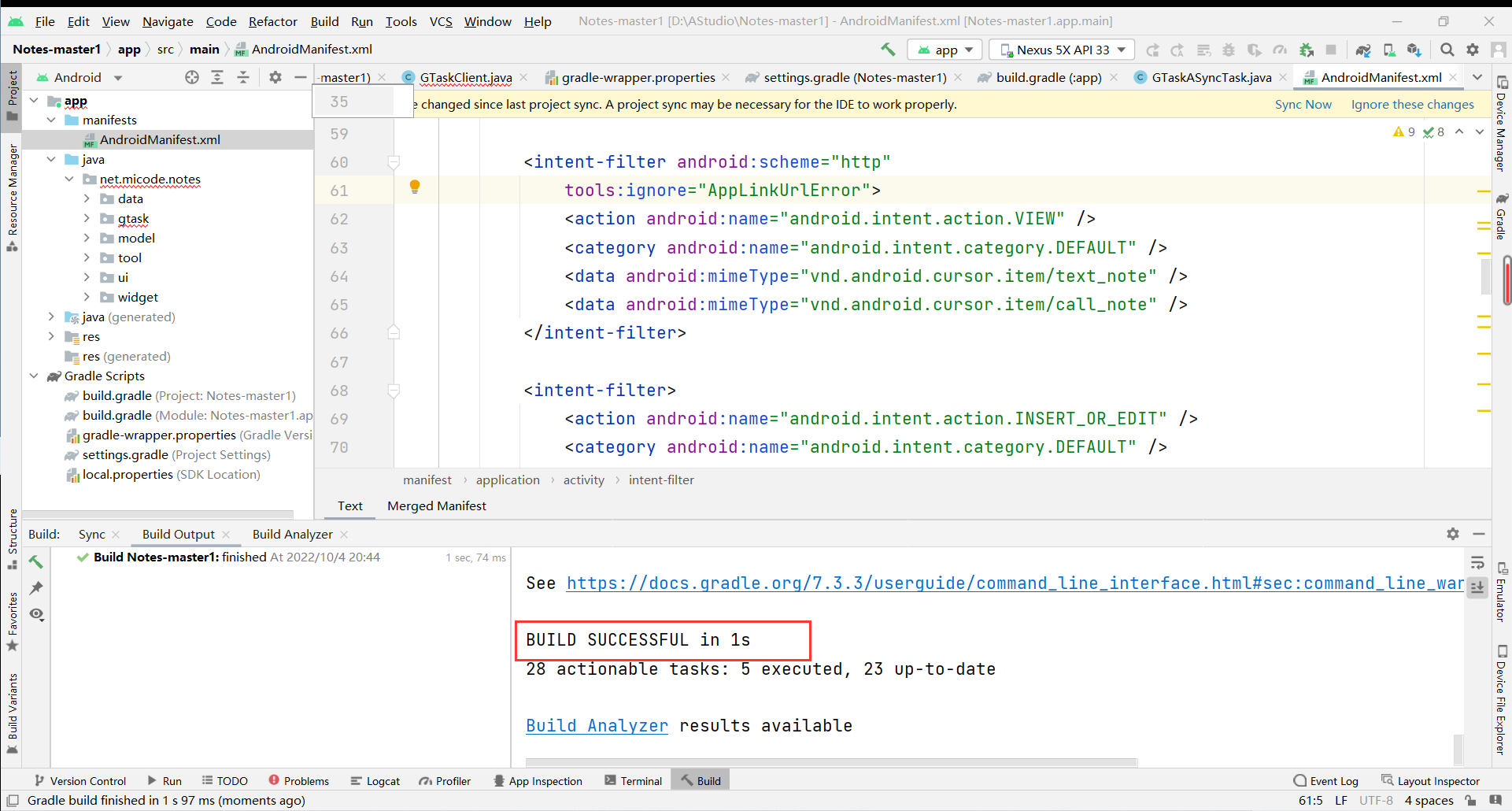 原因:在低于API Level 11版本,也就是Android 2.3.3以下的系统中,setLatestEventInfo()函数是唯一的实现方法;而在高于API Level 11的版本中setLatestEventInfo()函数已经被弃用了,于是我们需要根据现有的Android版本进行相应地重写该函数 解决方法:将GTaskASyncTask.java中的showNotification方法重写