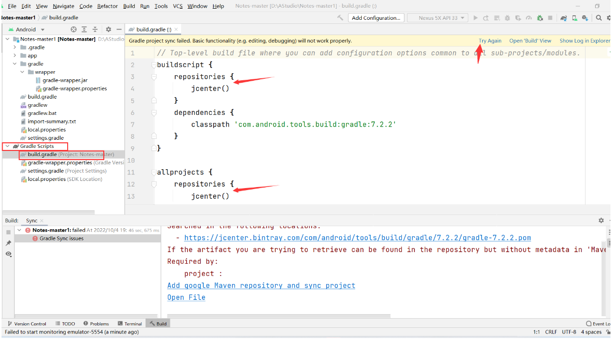 然后在 classpath处最后更改一下gradle的版本,我改成了7.2.2。都设置好后点击右上方的Try Again: