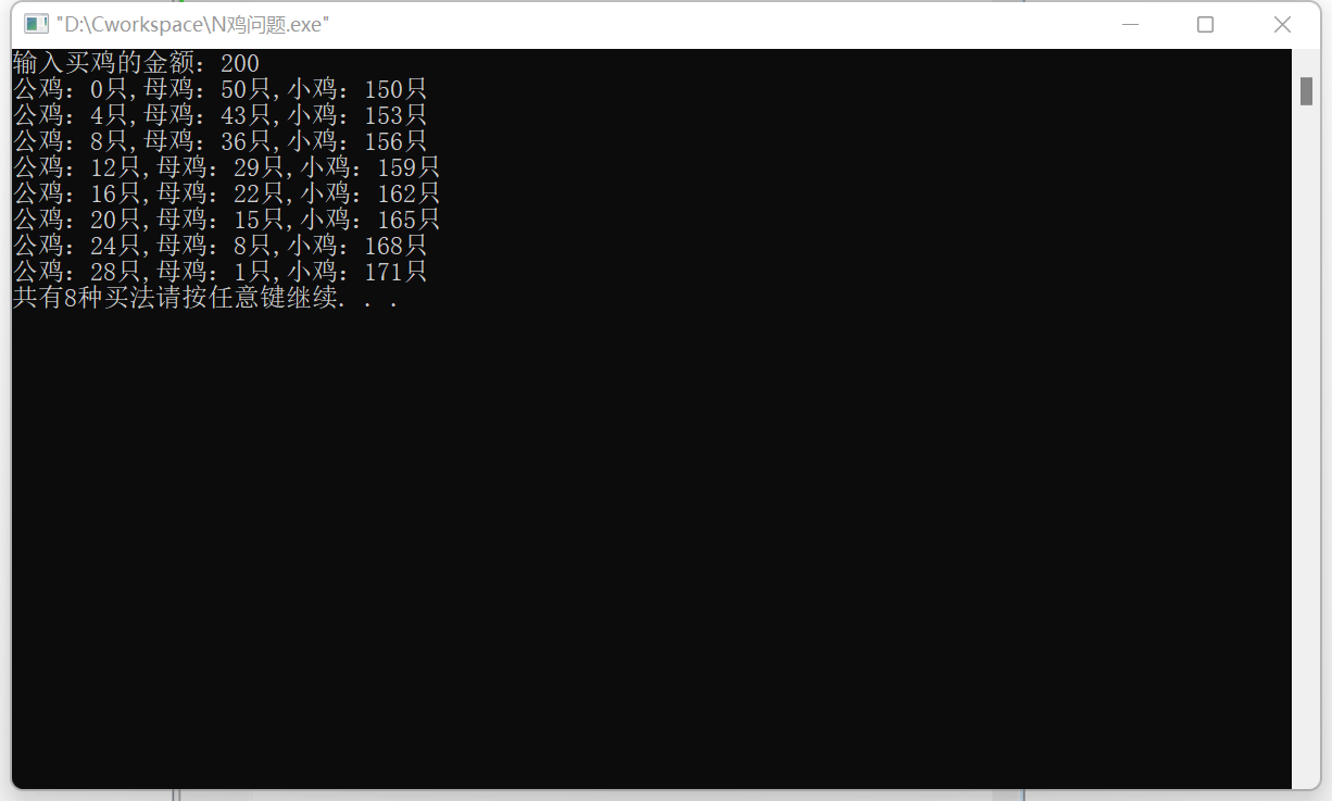 printf("公鸡:%d只,母鸡:%d只,小鸡:%d只\n",a,b,c);