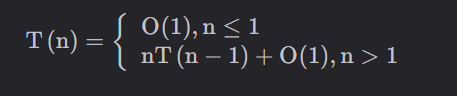 根据sort_print(List,start+1)建立时间递推关系,设T(n)表示规模为n的耗时,则规模为n-1的耗时为T(n-1),进入递归之前需要交换两个元素,递归回来之后又需要交换两个元素,耗时为常数O(1),递归和交换元素需要做n-start次,初始start=0,故循环n次。该语句的递推式为:T(n)=n(T(n-1)+O(1))。