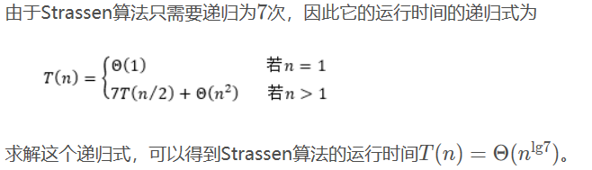 (4) 利用矩阵P1,P2,…,P7进行加减运算,得到输出矩阵C的子矩阵C11,C12,C21,C22这一步需要进行8次(n/2)×(n/2)矩阵的加减法,所以花费时为Θ(n2)