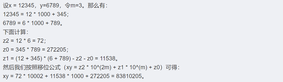 Karatsuba乘法是一种快速乘法。此算法在1960年由Anatolii Alexeevitch Karatsuba 提出,并于1962年得以发表。此算法主要用于两个大数相乘。普通乘法的复杂度是n^2,而Karatsuba算法的复杂度仅为3nlog3≈3n1.585(log3是以2为底的)。