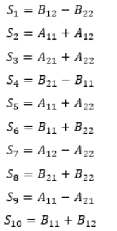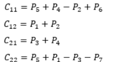 (3) 用步骤(1)分解得到的子矩阵和步骤(2)中创建的10个矩阵,递归地计算7个矩阵乘积P1,P2,…,P7