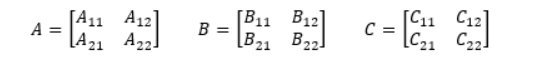 (1) 将输入矩阵A、B以及输出矩阵C各分解为4个(n/2)×(n/2)子矩阵。