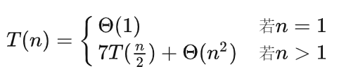 对比普通的矩阵相乘,这种矩阵相乘运用了递归分治的策略,其递归表达式为: