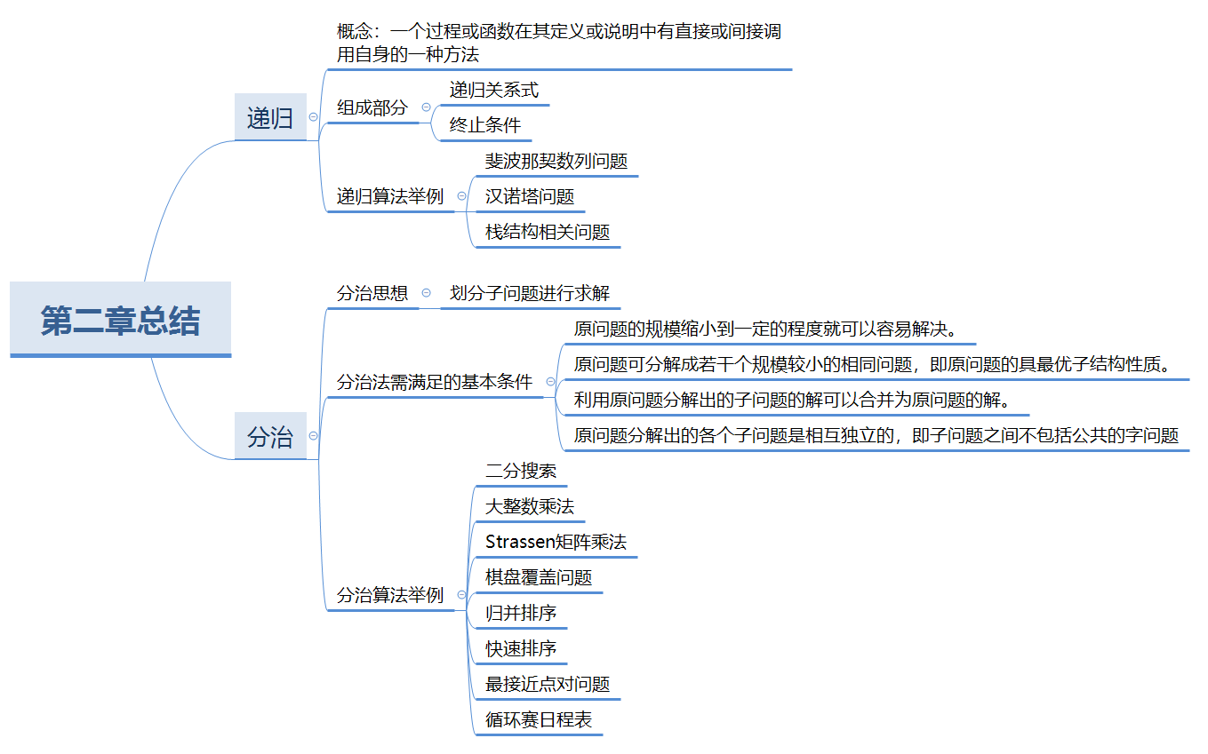 分治算法思想: 规模为n的原问题的解无法解决求出,进行问题规模缩减,划分子问题(子问题相互独立且和原问题的性质相同,只有问题的规模变小),一直递归划分到子问题可以很简单的求解,最后在将求出的小规模的问题的解合并为一个更大规模的问题的解,自底向上求出原问题的解。