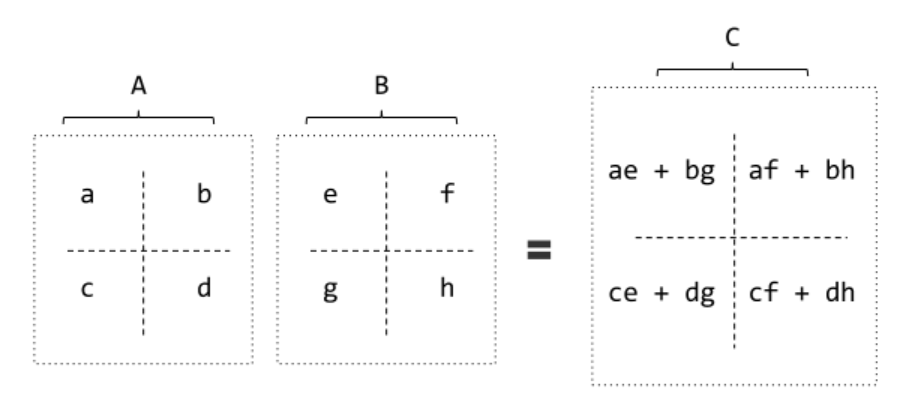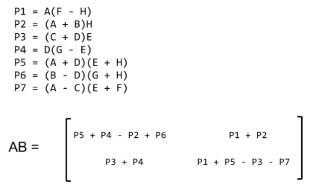 两个大小为 2 * 2 的矩阵相乘,一般需要进行 8 次乘法。而Strassen矩阵乘法可以减少一次乘法,只需要 7 次,在数据量很大的情况能够有效减少矩阵乘法运算的时间。