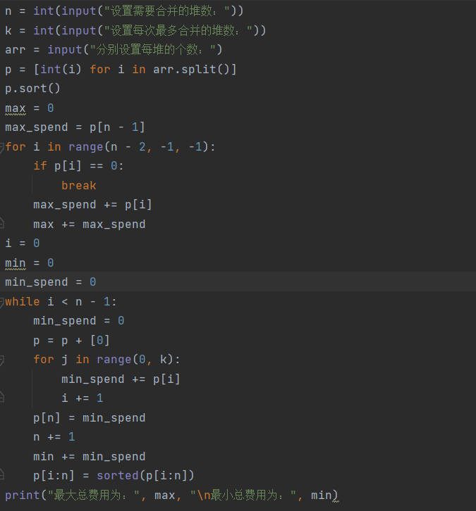 多元Huffman编码问题:在一个操场的四周摆放着n堆石子。现要将石子有次序地合并成一堆。规定每次至少选2堆,最多选k堆石子合并成新的一堆,合并的费用为新的一堆的石子数。试设计一个算法,计算出将n堆石子合并成一堆的最大总费用和最小总费用。
