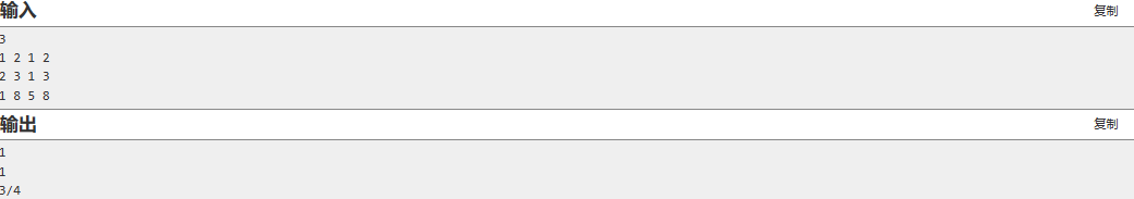 每行输出一个样例的结果,输出和。 如果结果的值为整数,那么只需要输出整数。 如果结果的值为分数,需要输出x/y的形式,并保证x,y互质。