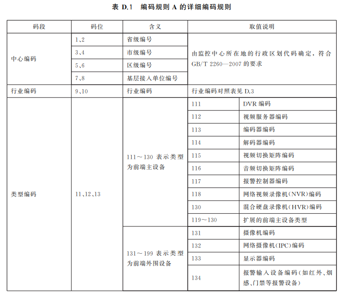 编码规则 A 的详细说明见表 D.1。其中,中心编码指用户或设备所归属的监控中心的编码,按照监控中心所在地的行政区划代码确定, 当不是基层单位时空余位为0。行政区划代码采用 GB/T2260— 2007规定的行政区划代码表示。行业编码是指用户或设备所归属的行业,行业编码对照表见 D.3。 类型编码指定了设备或用户的具体类型,其中的前端设备包含公安系统和非公安系统的前端设备,终端用 户包含公安系统和非公安系统的终端用户。