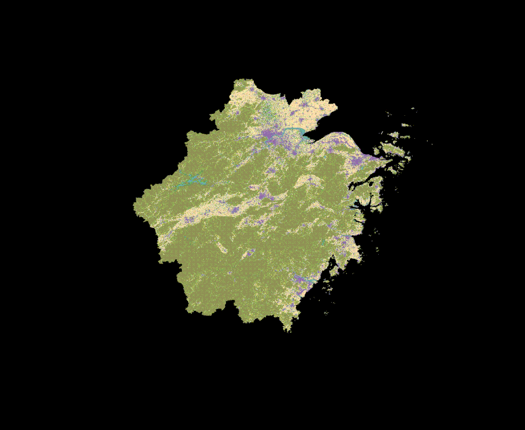 利用多年连续的土地覆盖数据,分析土地类型的变化,进而可研究区域内生态环境和质量的动态变化特征。如通过使用平台上2018-2020年的CLCD数据,制作浙江省土地覆盖变化时序图,还可分析各种土地类型的面积变化。