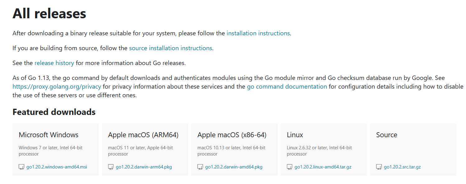 官网https://golang.google.cn/dl/下载安装,选择windows版本