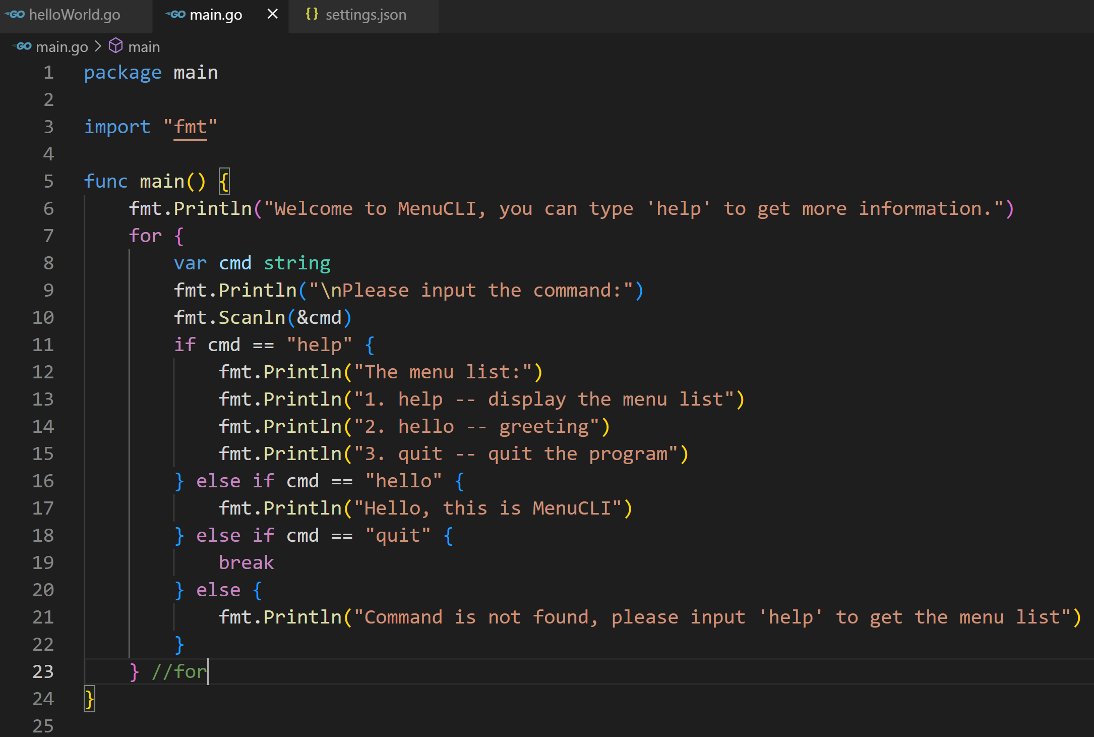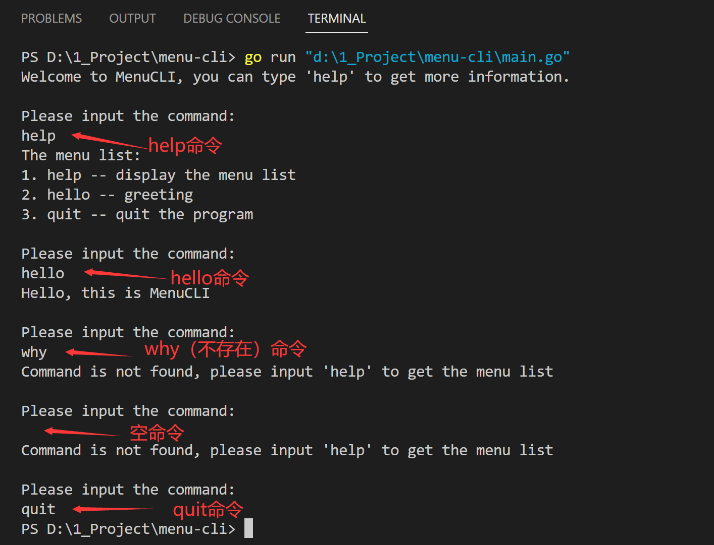依次输入help、hello、why、空、quit命令,输出结果符合预期。