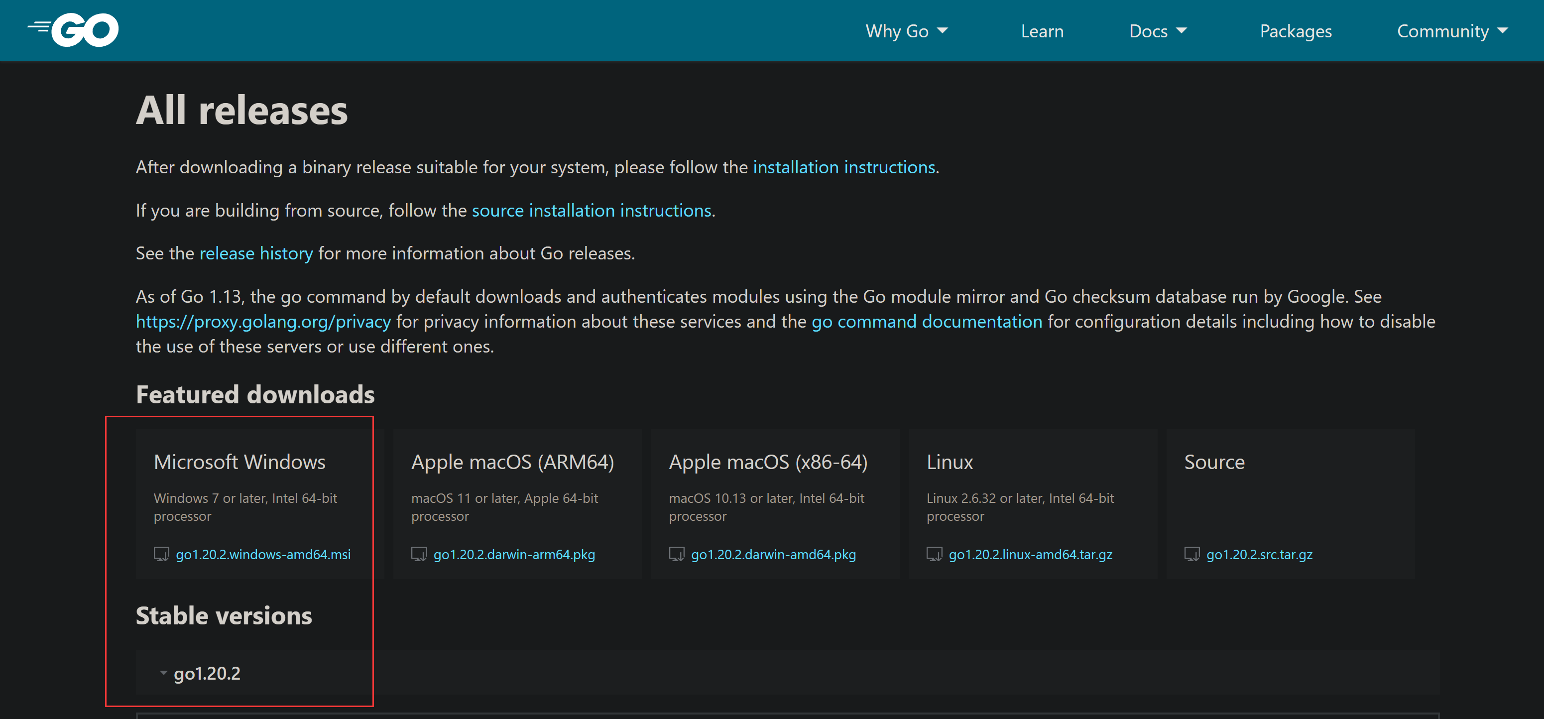 进入官网下载页面https://golang.google.cn/dl/,选择1.20.2稳定版,下载对应的win安装包