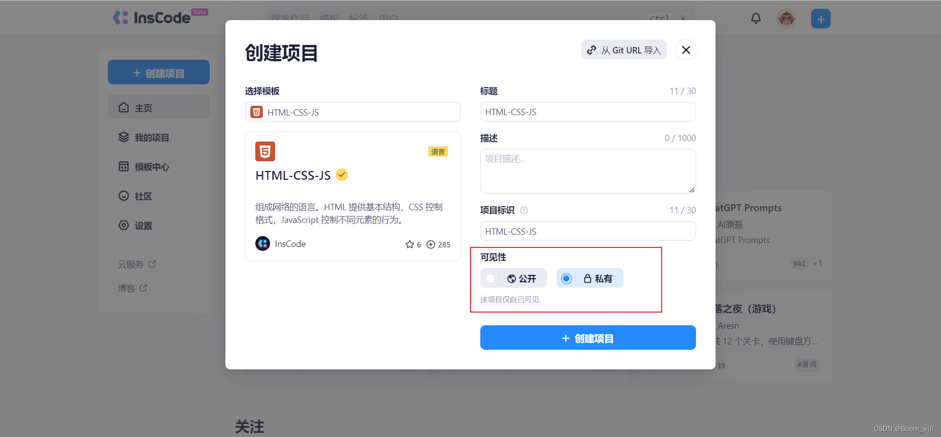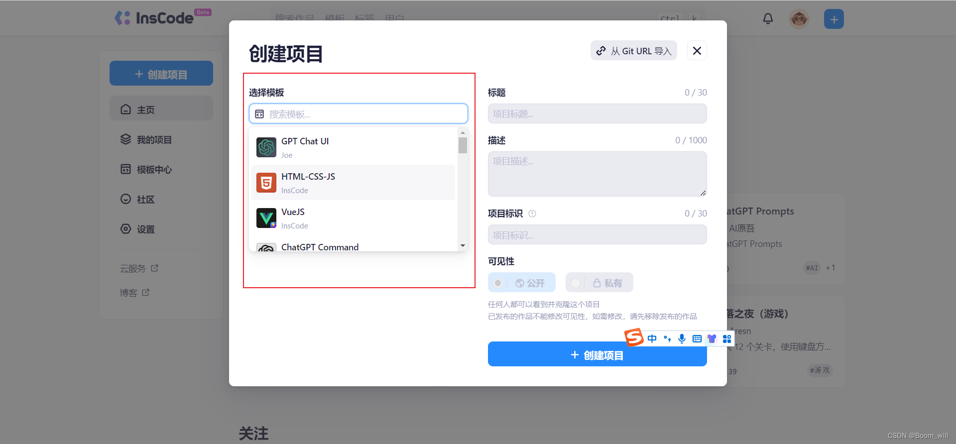 模板丰富,可以选择自己所需要的模板快速生成,也可以从GitURL中导入项目。可以把项目公开或者私密自己看,这样可以分享给他人,也可以自己保留,满足不同的需求。