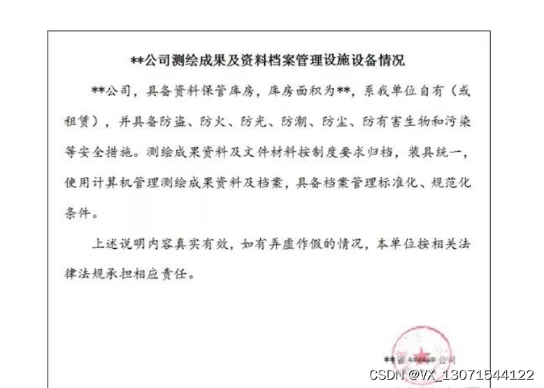 **公司,具备资料保管库房,库房面积为**,系我单位自有(或租赁),并具备防盗、防火、防光、防潮、防尘、防有害生物和污染等安全措施。测绘成果资料及文件材料按制度要求归档,装具统一,使用计算机管理测绘成果资料及档案,具备档案管理标准化、规范化条件。上述说明内容真实有效,如有弄虚作假的情况,本单位按相关法律法规承担相应责任。