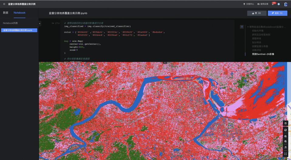 平台的案例广场中提供了进行地表覆盖监督分类的应用案例,我们利用ESA地表覆盖数据作为随机采样的训练样本真值标签,对单景Sentinel-2A影像采用自适应集成分类器(aie.Classifier.adaBoost)进行地物覆盖的分类,并利用混淆矩阵进行分类精度的分析。