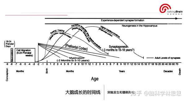 连结模式在大脑内微观结构上的体现就是神经元和神经元之间信息传递的基本单位——突触结构,以及影响后续信息传导速度的神经元轴突的髓鞘化。而突触数量和轴突髓鞘化进程与儿童脑功能发展之间的时间关联已经基本明确,详见下图。