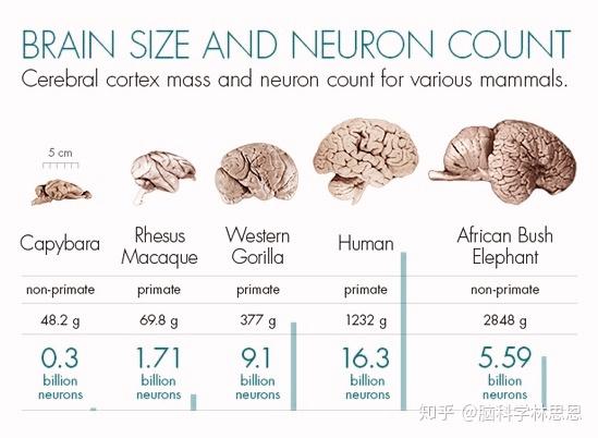 从这张图我们可以清晰感受到,脑的大小和重量并非智力的决定因素,神经元的数量才是。这类似于计算机芯片的晶体管数量和晶体管集成度决定电脑的运算速度。