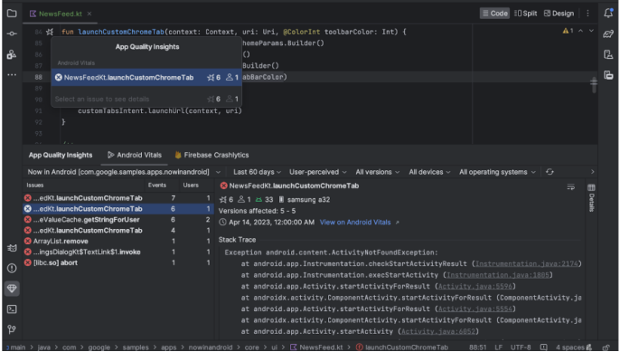 App Quality Insights 在 Android Studio Electric Eel 中推出,可直接从 IDE 访问 Firebase Crashlytics 问题报告。通过集成,您只需单击一下即可在堆栈跟踪和代码之间导航,使用筛选器仅查看最重要的问题,并查看报告详细信息以帮助您重现问题。在Android Studio Hedgehog中,您现在可以查看由Google Play提供支持的Android Vitals的重要崩溃报告。Android 指标报告还包含有用的数据分析,例如 SDK 提供商提供的注释,以便您可以快速诊断和解决与您的应用可能正在使用的 SDK 相关的崩溃问题。
