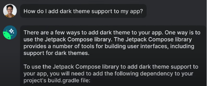 除了聊天界面,Studio Bot还提供了许多入口点 , 与您的开发流程集成 , 单击添加生成的代码:Studio Bot 在它生成的代码,可让您快速将代码插入到打开状态编辑器,将其插入 Android 清单,甚至添加所需的依赖项 对于答案中使用的流行库。