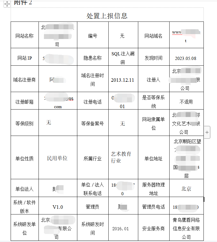 限期整改报告写完后,要填写处置上报信息,包括域名,公司名称,备案号,域名注册地址,服务器所在地,法人,联系方式,防火墙类型,等保备案号,隐患名称,网站所属行业以及单位性质,网站管理员,联系电话,网站系统的研发时间等等都要详细的填好后,将盖章好的限期整改通知书扫描件、整改报告、处置上报信息等3个文件回传给网安那面,有些地区可以发送邮件,有些需要去现场提交纸质版本,具体就是这样的一个解决过程,也希望我的分享能帮助到更多遇到这种情况的你们,希望大家少走弯路,将损失降到最低。
