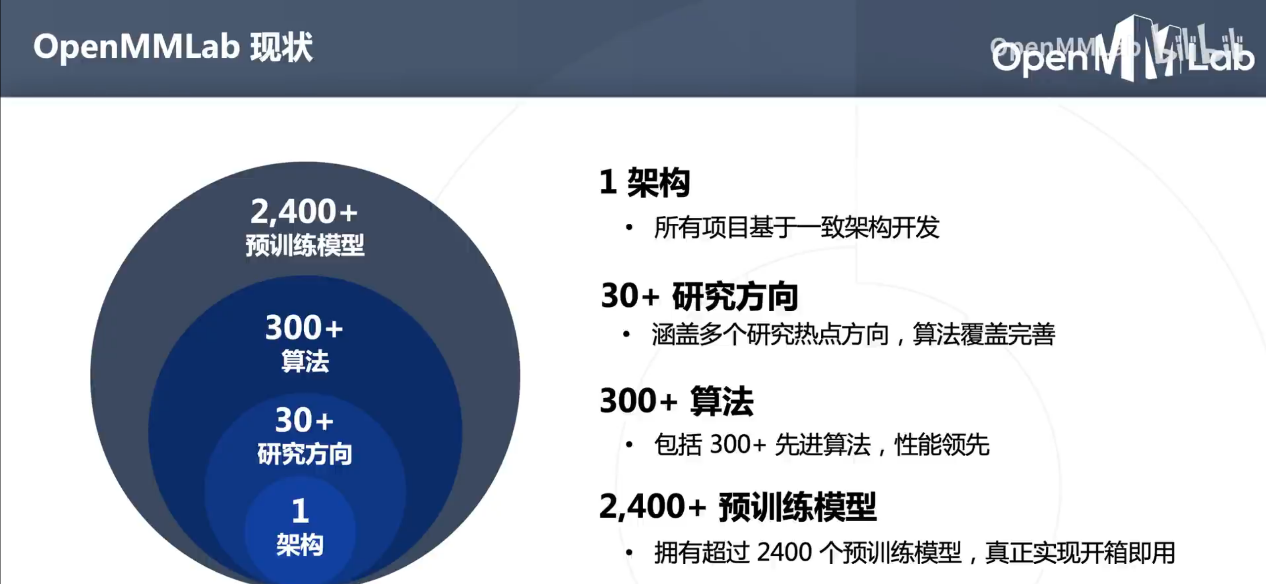 OpenMMLab集成了cv领域内绝大多数的经典以及最新的算法,开源了很多国内对于计算机视觉研究的算法模型,拥有很好的生态环境和研究氛围