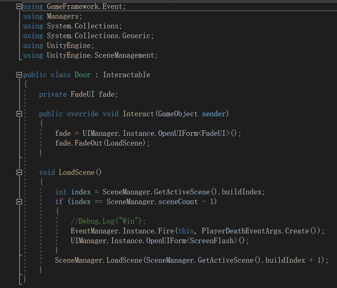 以下是挂载在门上的脚本代码,当玩家靠近门时,便会进入下一个关卡