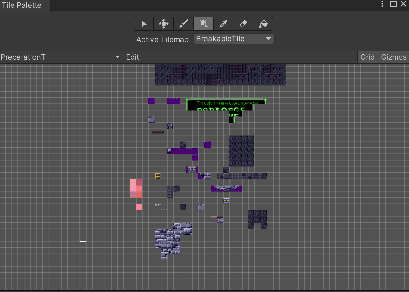 上图是导入素材后的调色板,可以选择画笔或吸取工具选取需要的tile在场景中对应的tilemap进行绘制,多熟悉调色板上方的工具用法可以让地图的开发事半功倍:例如地图场景中有些模块可以复用,就可以直接选取一大块tile复制并移动,而不需要重新绘制。