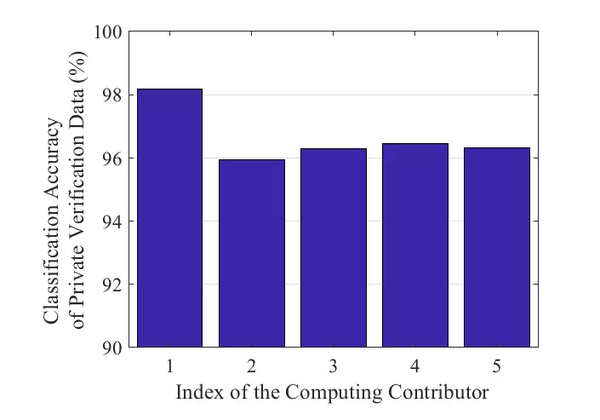 假设有5个计算贡献者,每个计算贡献者使用三层卷积神经网络作为分类器,并且每个计算贡献者拥有MNIST数据集中的一部分作为本地数据。
