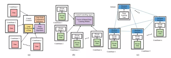 一种是中心化的深度学习架构。如图1(a)所示,中心服务器收集来自数据贡献者的数据,然后进行统一的存储和处理。