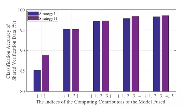 从图6中,我们可以观察到,验证贡献者验证数据的分类准确率随着模型融合数量的增加而增加。因此,可以认为所有的模型都对给定的任务有所贡献。从图6中也可以看出,利用策略II实现的融合模型精度比使用策略I获得的融合模型精度稍好。