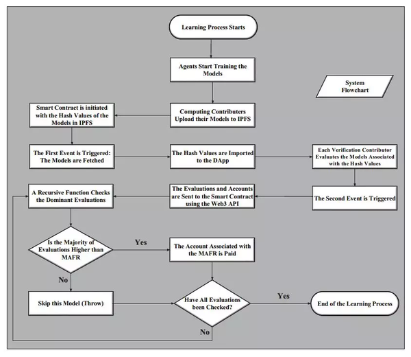 此外,参与计算的贡献者能够依照其贡献的价值得到一些财务上的奖励用于激励。为了能够实现上述目的,作者使用以太坊作为区块链平台设计了智能合约来确保网络陌生节点之间交易互信,从而实现了自主协作的非中心化深度学习框架。