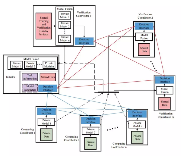 下面我们从图2中来看一看,作者提出的深度学习框架机制的详细情况。如图2所示,个体的参与者可以在这个框架中充当应用发起人、计算贡献者或是验证贡献者。