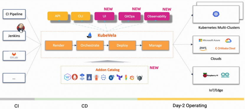 KubeVela是一个开箱即用的现代化应用交付与管理平台,其核心概念包括组件(Component)、运维特征(Trait)、应用策略(Policy)、工作流步骤(Workflow Step)等。KubeVela围绕着云原生应用交付和管理场景展开,背后的应用交付模型是Open ApplicationModel,简称OAM。使用KubeVela的软件开发团队,可以按需使用云原生能力构建应用,随着团队规模的发展、业务场景的变化扩展其功能,一次构建应用,随处运行。