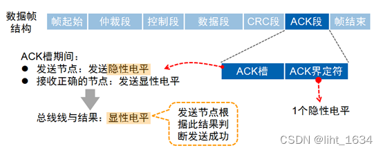 CAN信息发送成功后,会有个应答间隙的,在这个间隙内,接收节点可以准备要回复的信息,也就是把应答场填充为显性0,在发送时其为隐性1。应答过程可能如下:当信息传输到ACK前的Del时,可以认为信息已经传输完毕,接收节点也接收到了足够的信息来检测接收的信息是否正确,所以这时接收节点就会检测信号是否正确,如果正确,就将ACK置位为显性0,注意这时,发送节点因为还在发送而接收节点又将ACK信息置位为1,所以它就会在回读时检测到ACK为0,判断接收成功。注意:这其中有个接收节点用显性覆盖隐性---覆盖ACK位的过程,覆盖+回读。
