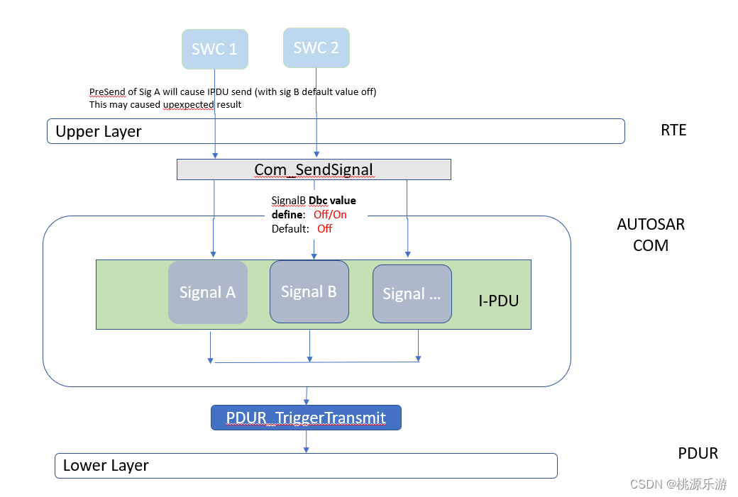 这样即便多个SWC下发同帧不同信号时,因默认值被带到CAN上也不会生效,可以有效避免下发冲突。