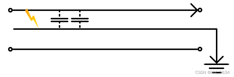 静电耦合对电场敏感,也叫电场耦合或容性耦合,一般电压大电流小,其简化模型如下:干扰方和受害方之间通过电容耦合,干扰方产生的电场会通过电容(pF级别)作用于受害方,进而在受害方产生噪声,这就是静电干扰。