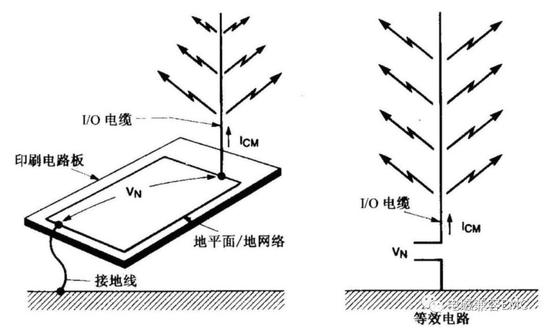 第二类等效天线是单极天线或偶极子天线,是由产品中的线缆或其他尺寸较长的导体构成。驱动电流通常是共模电流,是系统地与接地平面(大地)之间的电压降造成。此类由共模电流导致的辐射通常称为共模辐射,如下图。