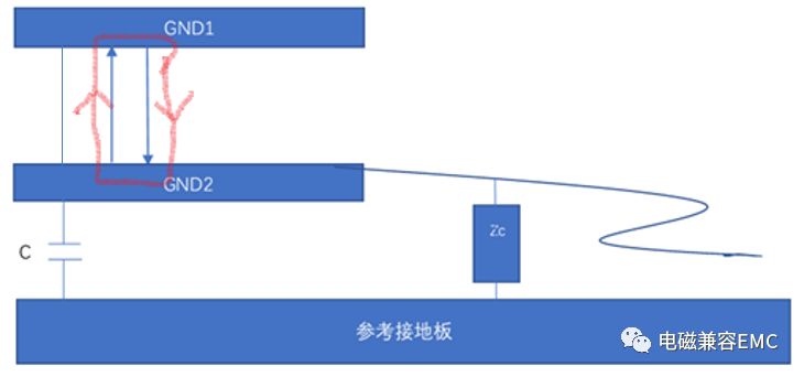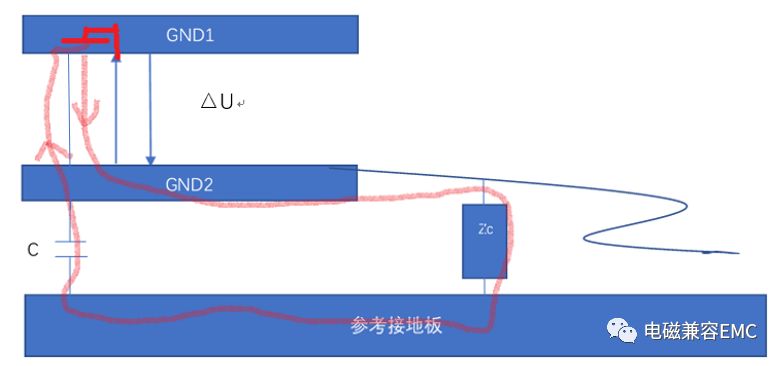 △U通过线缆对参考地的等下电阻Zc和GND1对参考地的寄生电容C构成了共模电流的回路。在回路中,共模电流流过线缆,当线缆长度与信号波长可以相比拟时,就会产生辐射。